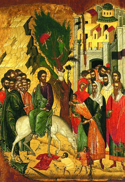 męki i śmierci na krzyżu. Tłumy witające wkraczającego do Jerozolimy Pana rzucały na drogę płaszcze i gałązki, wołając: „Hosanna Synowi Dawidowemu”. Triumf Chrystusa i Jego Ofiara